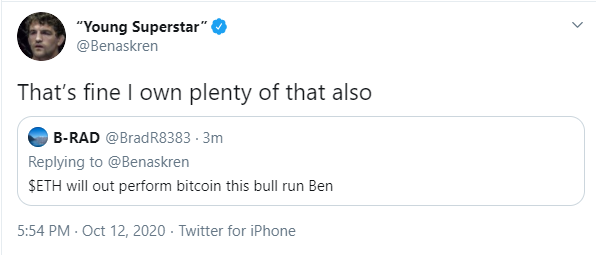 The ETH price has gained close to 12% over the past seven days, which outperforms bitcoinâs 8.5% gains over the same period, according to CoinMarketCap data. ETH bulls are hopeful that the second-biggest cryptocurrency is just getting started in this cycle, which would be just fine for retired MMA fighter Ben Askren, who is a bitcoin bull and also owns âplentyâ of Ethereum.