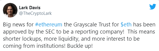 The ETH price has been higher in celebration, gaining nearly 6% to $394 amid a rally in the broader cryptocurrency market. Now that the Ethereum Trust has the SEC reporting status, its shares become registered under the Securities Exchange Act of 1934. And now that itâs official, the Grayscale Ethereum Trust will be making regular filings with the SEC, including quarterly and annual reports, all of which bodes well for institutional investor interest.
