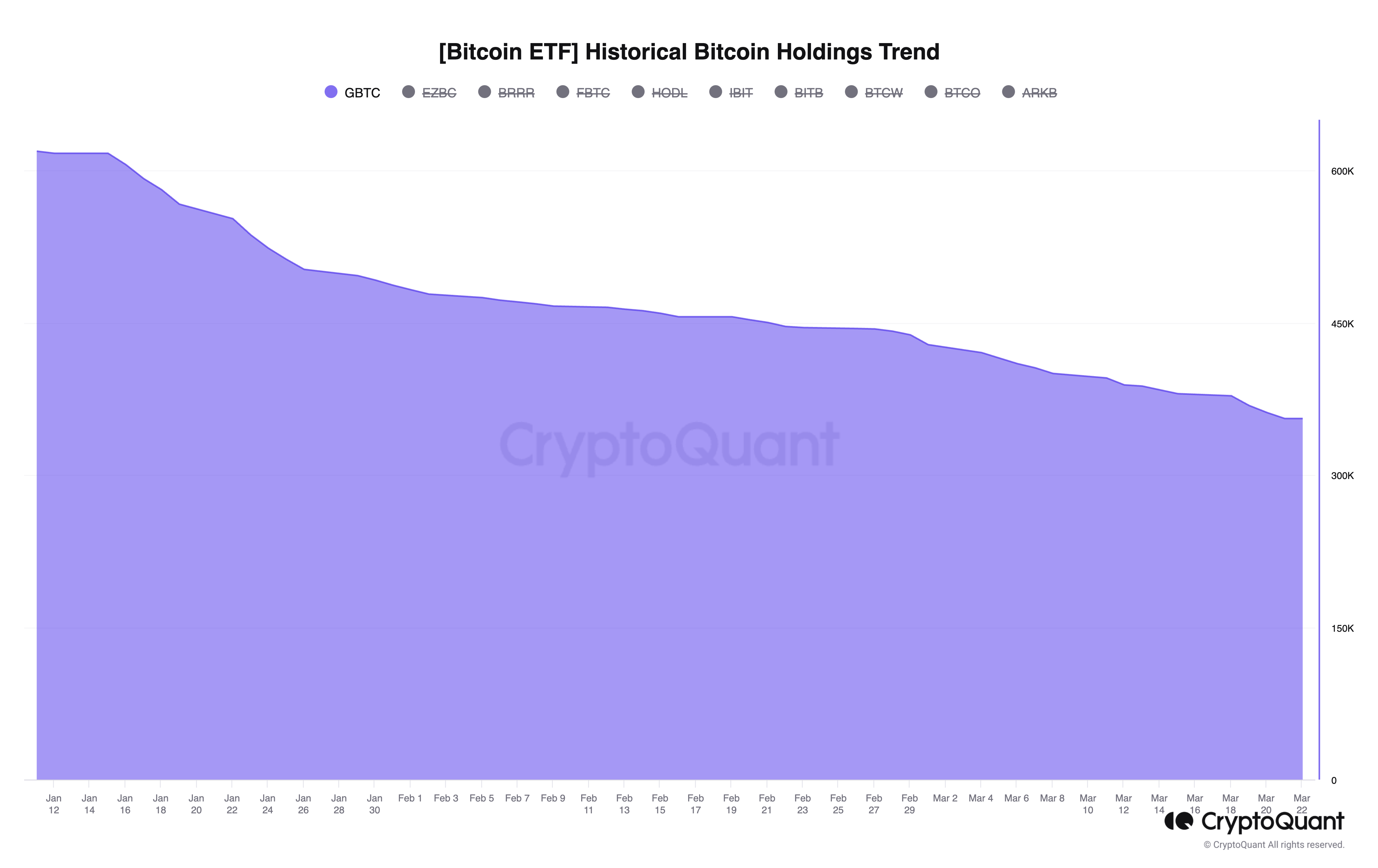 Since its conversion into a spot Bitcoin ETF in January, Grayscale’s Bitcoin balance has plummeted by 266,470 BTC. This marks a significant decline from its initial holding of approximately 620,000 BTC.