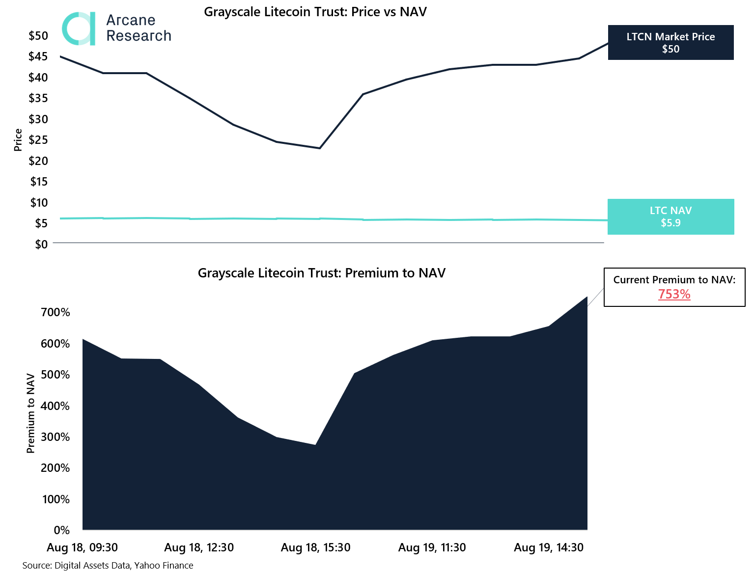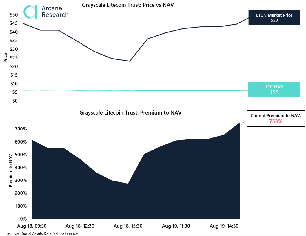 On Wednesday, just one day after the launch, the Litecoin Trust was selling at a 753% premium to the NAV (Net Asset Value), according to Arcane Research. This means that a share of the trust (which mainly holds Litecoin) is worth over seven times its net value.