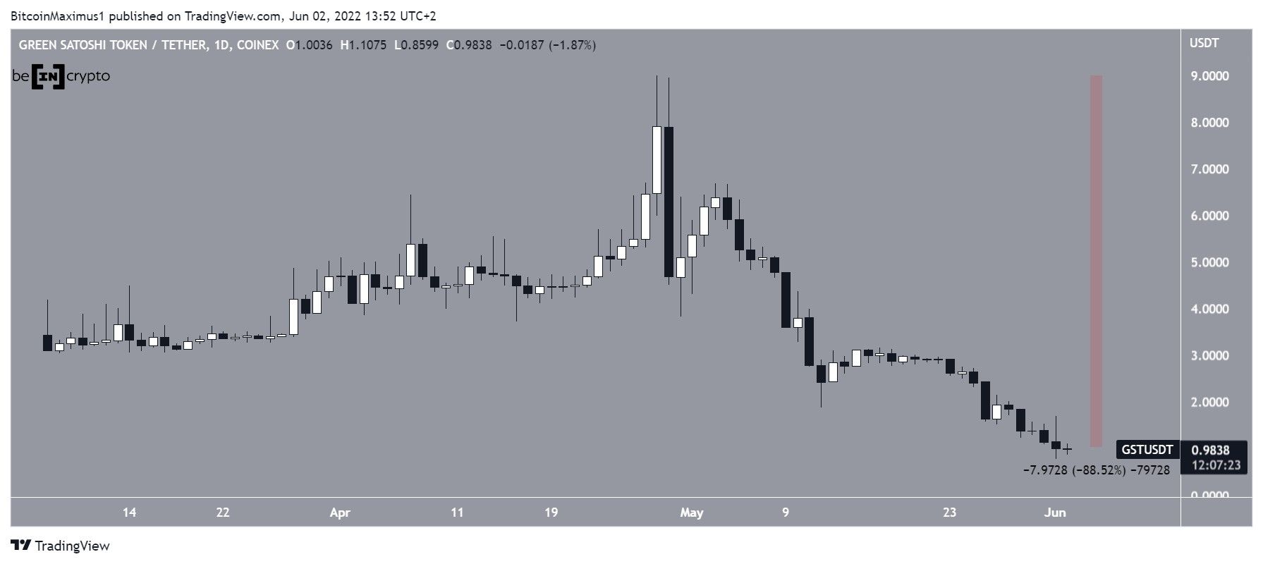 GST is the in-game token of STEPN, the first move-to-earn NFT game in which players earn tokens by walking or running. The token was launched in Dec. 2021 and proceeded to reach an all-time high of $7.82 on April 29, 2022. But, it has been falling since and reached an all-time low price of $0.70 on June 1.
