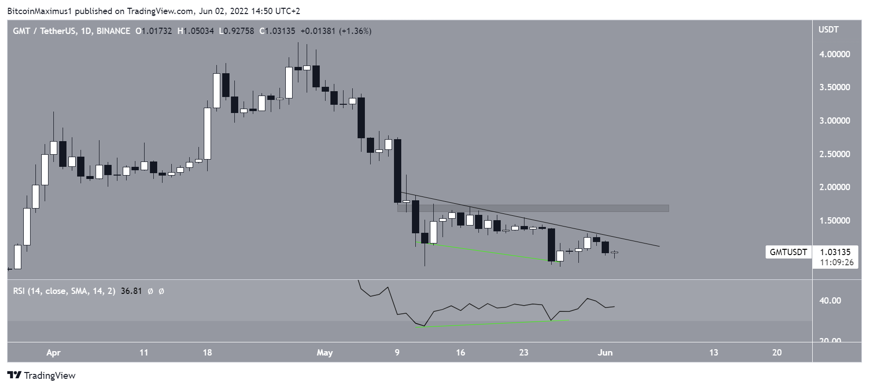 GMT seems to have created a double bottom, which is considered a bullish reversal pattern. The pattern has also been combined with a bullish divergence in the RSI.Â