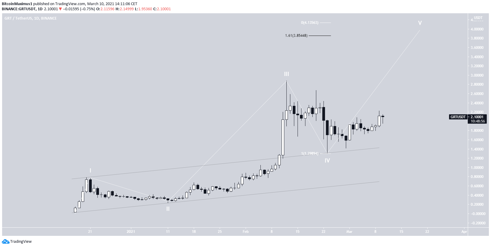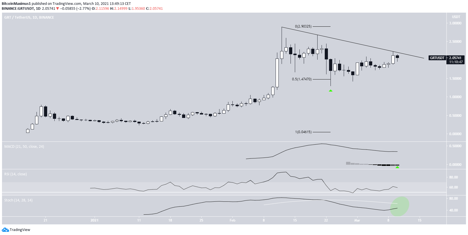 GRT has been moving downwards since reaching a high of $2.88 on Feb. 12. The decrease continued until Feb. 23, when the token reached a low of $1.30. The token bounced and has been increasing since. The bounce occurred right above the 0.5 Fib retracement level of the most recent upward movement.