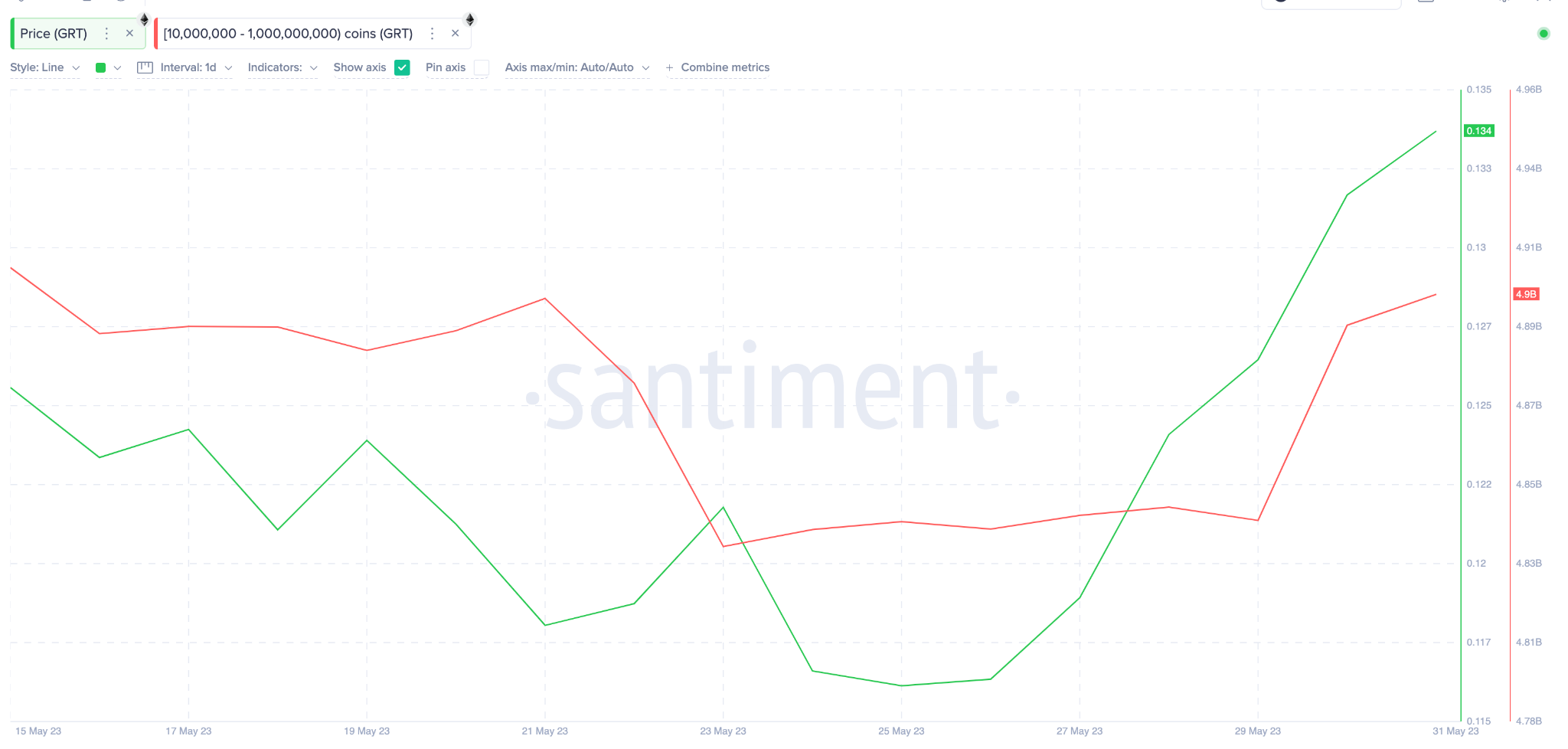 Santiment’s chart below shows that crypto whales holding balances of 10 million to 1 billion GRT tokens have increased their holdings significantly. Between May 23 and May 31, they added 70 million GRT tokens to their holdings.
