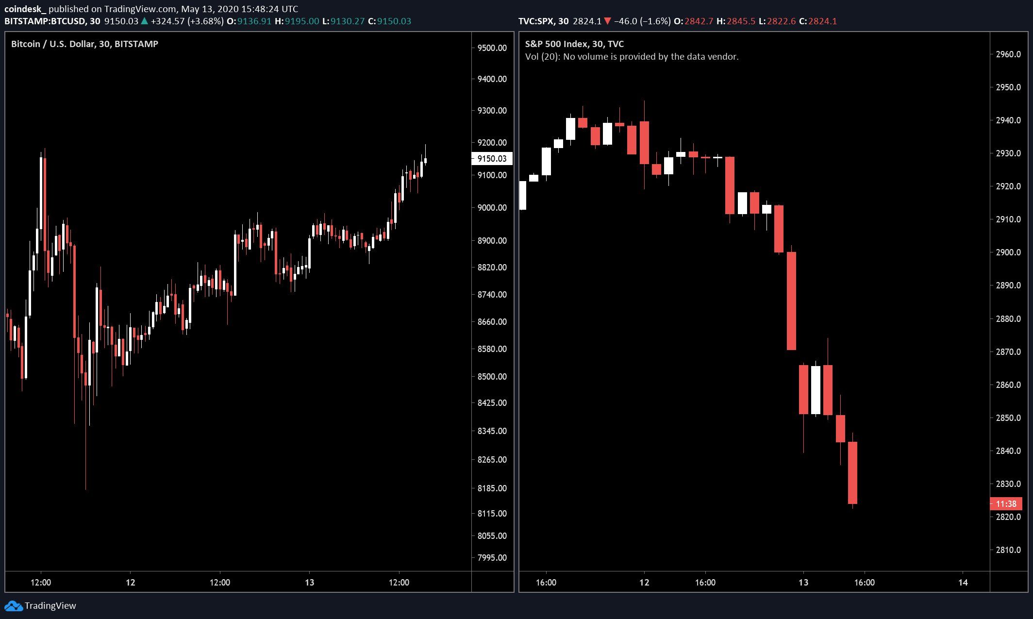 This discrepancy was noted by Bitcoin trader @ZackVoell, who tweeted an image that shows a side-by-side comparison of the Bitcoin price (left) and the SPX (right). In the image, it is clearly visible that BTC has gradually moved upwards, while SPX has decreased sharply.