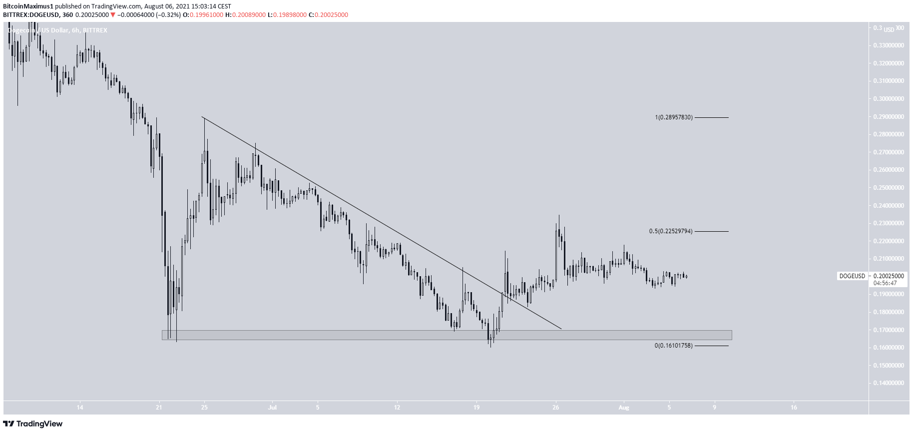 It reached a high of $0.234 on July 26, but was rejected by the 0.5 Fib retracement support level.