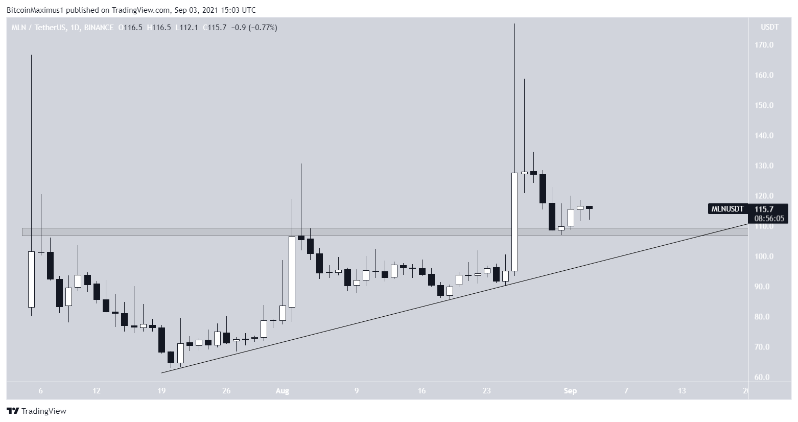 MLN has been increasing alongside an ascending support line since July 21. While it was initially rejected by the $108 resistance area, it managed to break out amid a large bullish candlestick on Aug 26.