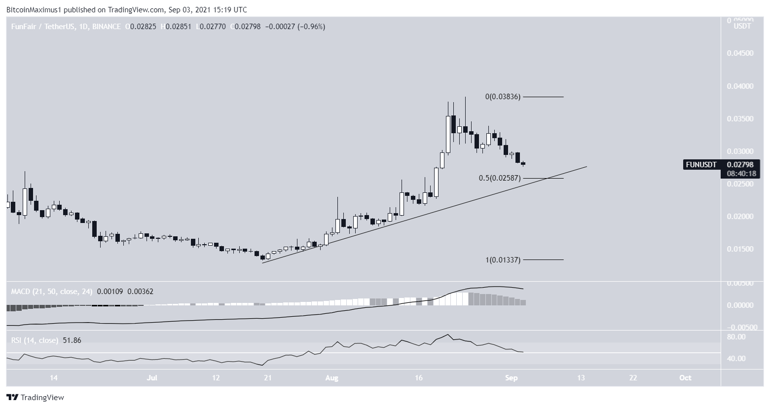 FUN has been increasing alongside a descending resistance line since July 20, when it was trading at a low of $0.013. The upward move continued until a high of $0.038 was reached on Aug 24.