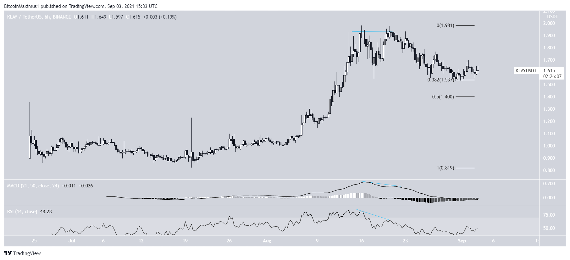 KLAY has been moving downwards since Aug 16, after it reached an all-time high price of $1.98. It created a double top pattern on Aug 20 and has been moving downwards since.