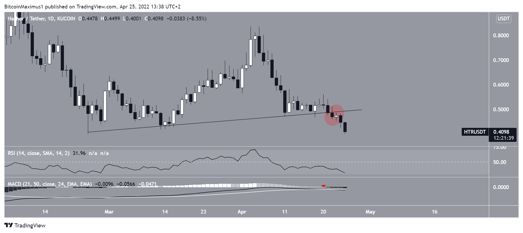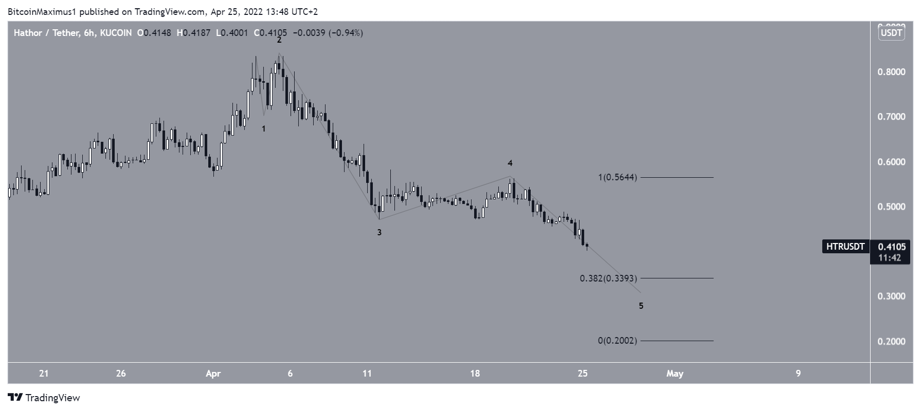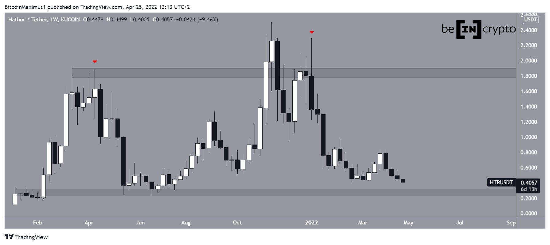 HTR has been falling since reaching a high of $2.490 on Nov. 21. After a sharp drop, the price initiated an upward movement, but only ended up creating a lower high (red icon) in the beginning of Jan. 2022. So far, the downward movement has so far led to a low of $0.40 on April 25.Â