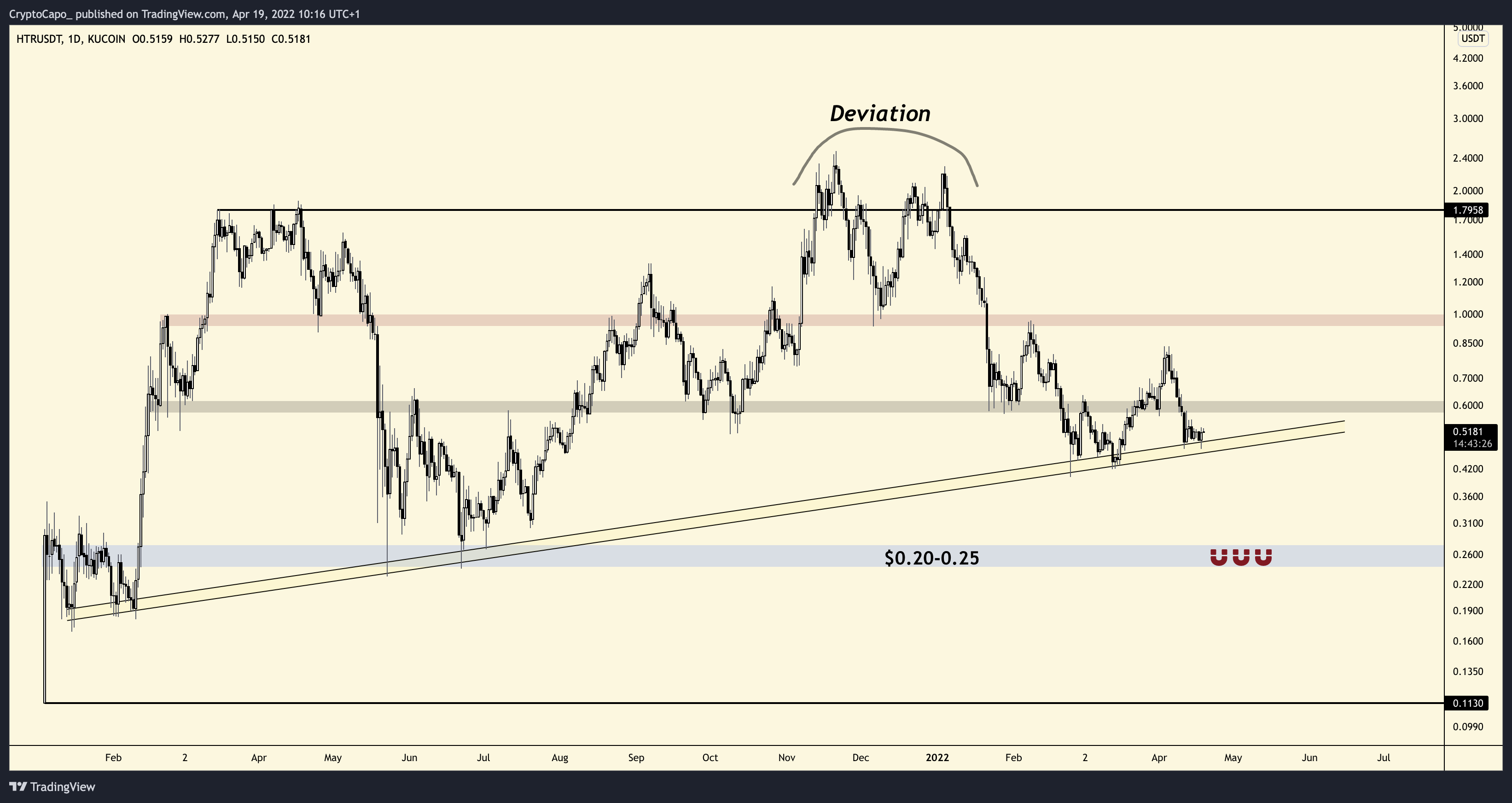Cryptocurrency analyst @CryptoCapo_ tweeted a chart of HTR, stating that if it breaks down from the current channel, it will fall to $0.20-$0.25. The level coincides with the horizontal support area outlined above.