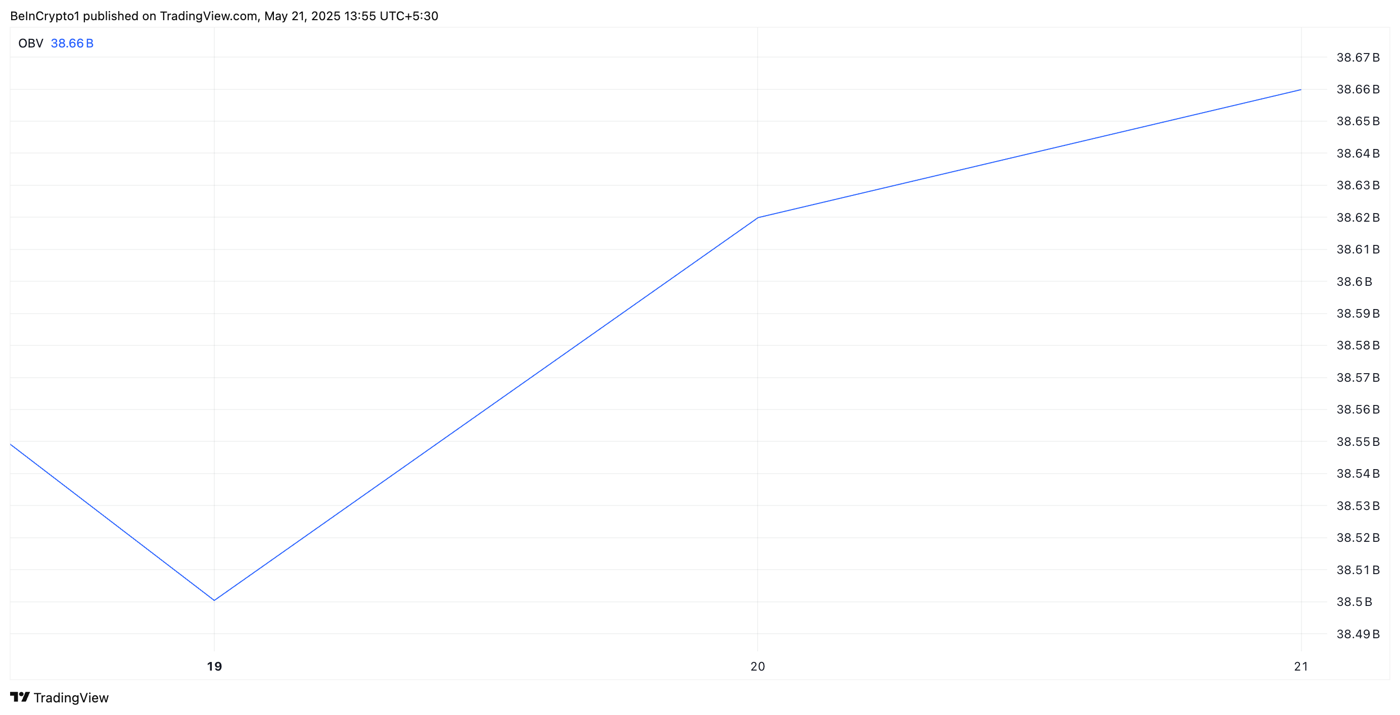 The OBV measures buying and selling pressure by tracking cumulative trading volume based on whether prices close higher or lower. When OBV climbs this way, it indicates that volume is flowing into the asset on up days, suggesting increasing demand and potential for a price rise.