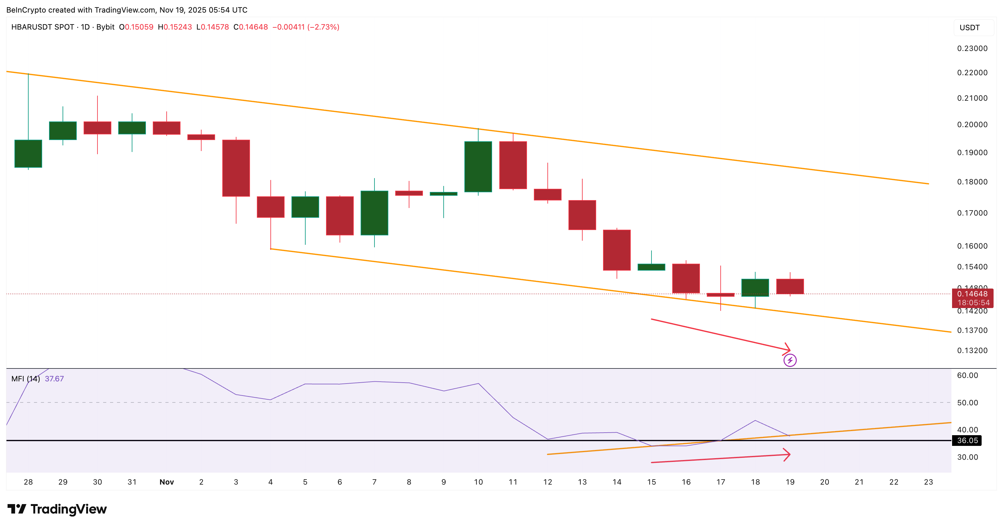 HBAR price has been moving inside a falling channel, which is a bearish continuation pattern. It tried to break below the channel on November 17 as the dip buyers stepped back for a while. This is visible as during the failed breakdown attempt, the Money Flow Index (MFI) broke down the ascending trendline. The MFI indicator tracks dip buying using price and volume.