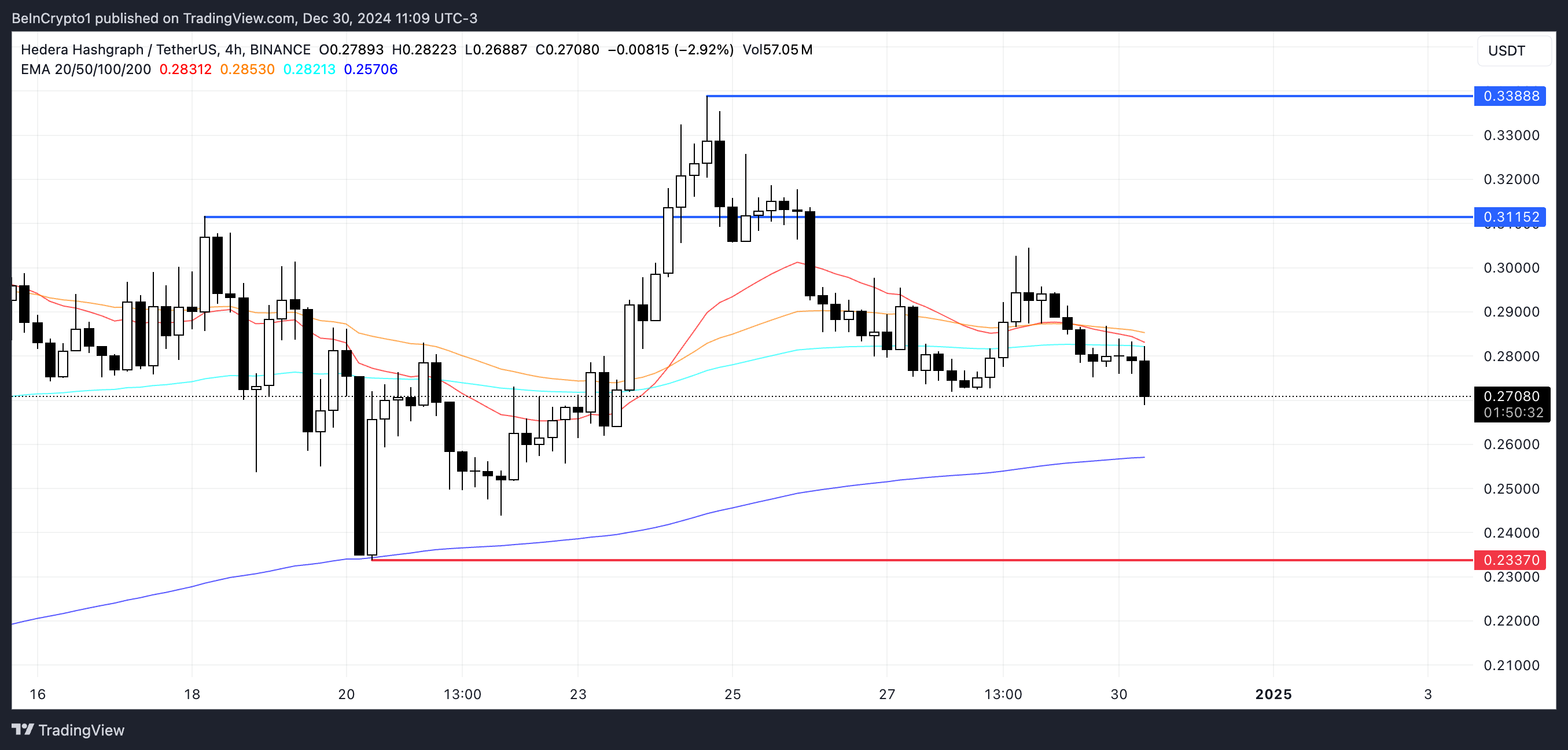 Hedera (HBAR) price reached multiple highs in December but has now fallen more than 4% in the last 24 hours.