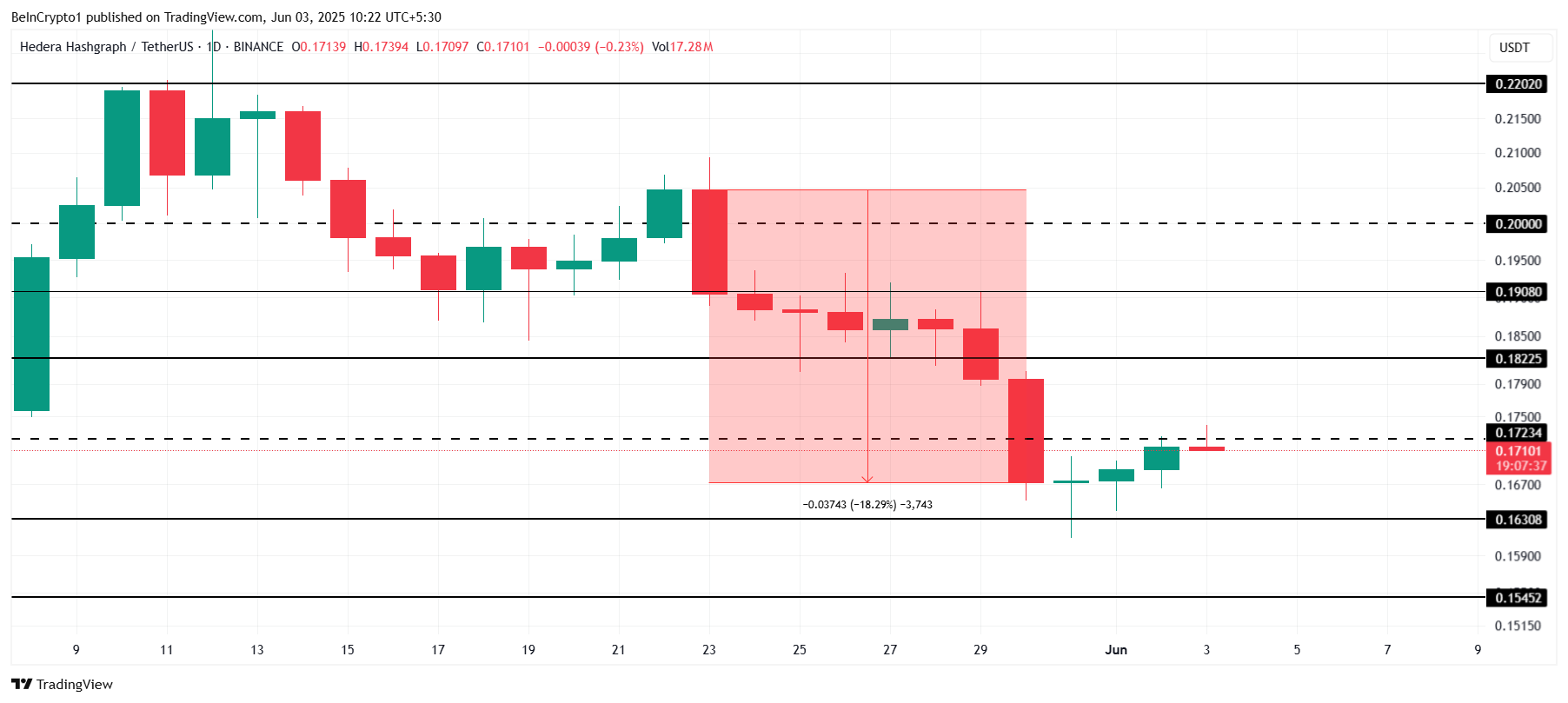 On the other hand, if HBAR can flip the $0.172 level into support, there is a chance for the altcoin to bounce back toward the $0.182 resistance level. A successful breach of this resistance would invalidate the bearish thesis, signaling a potential recovery for HBAR.