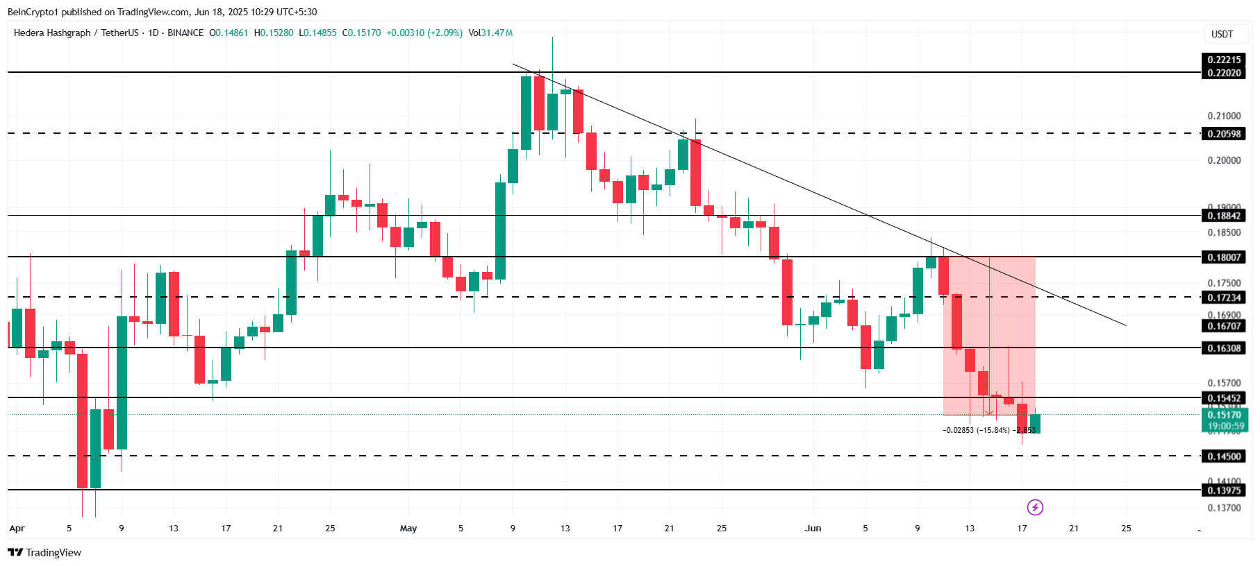 Currently, HBAR is trading at $0.151, down 15.8% over the past week and under the resistance at $0.154. The altcoin is struggling to break free from its two-month low but is showing signs of recovery.
