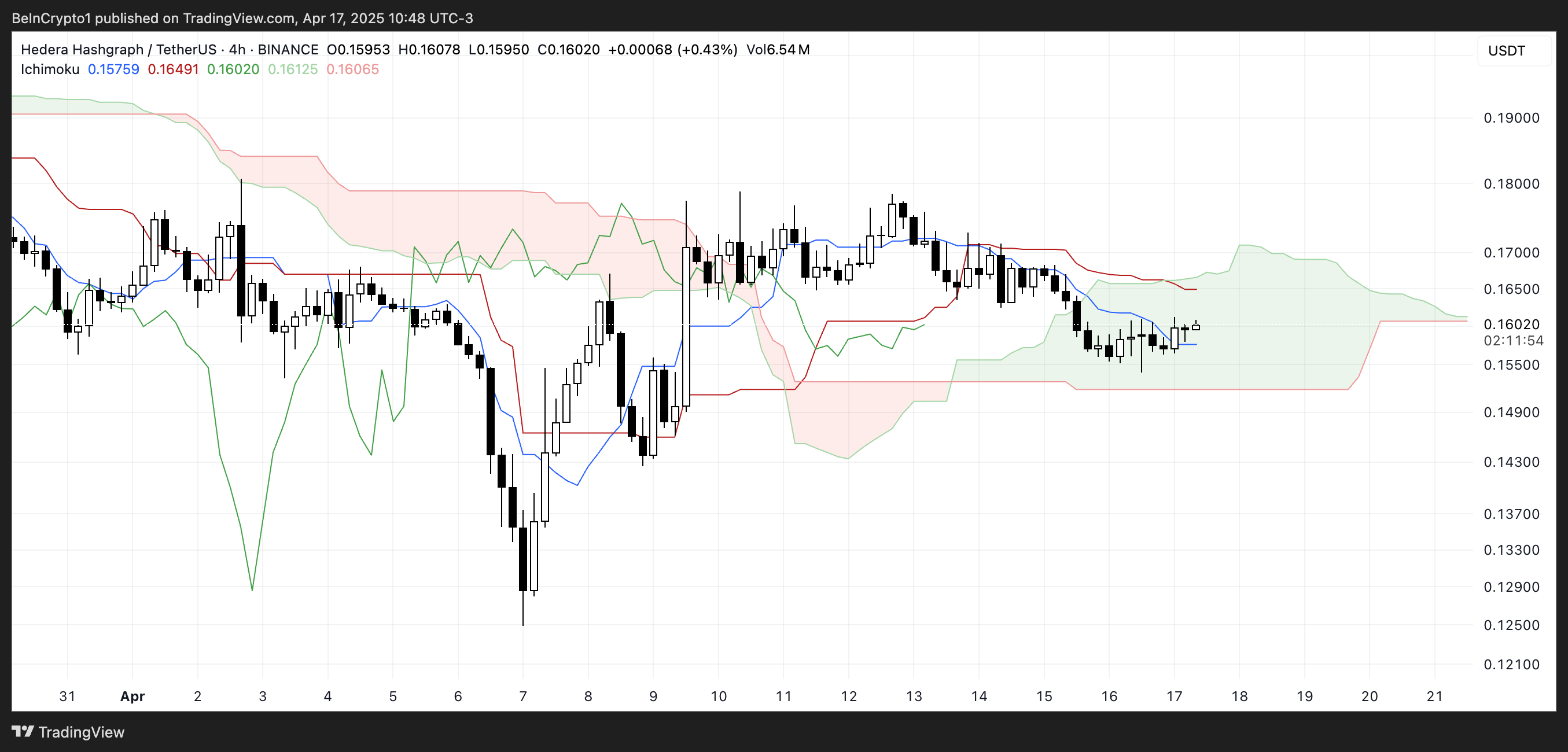 The Ichimoku Cloud chart for HBAR reflects a mostly neutral to slightly bearish trend.