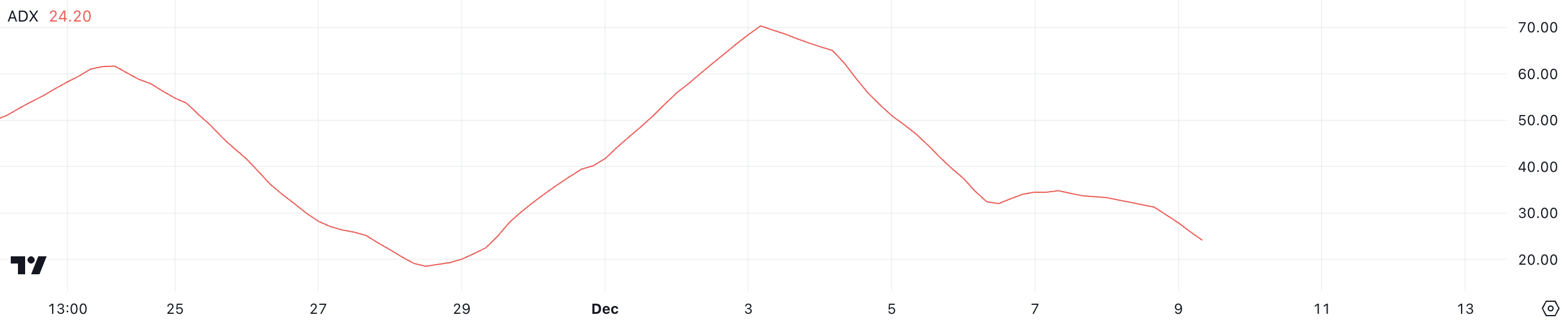 The coin’s price peaked at $0.39 on December 3, but since then, both the price and the ADX have been declining.