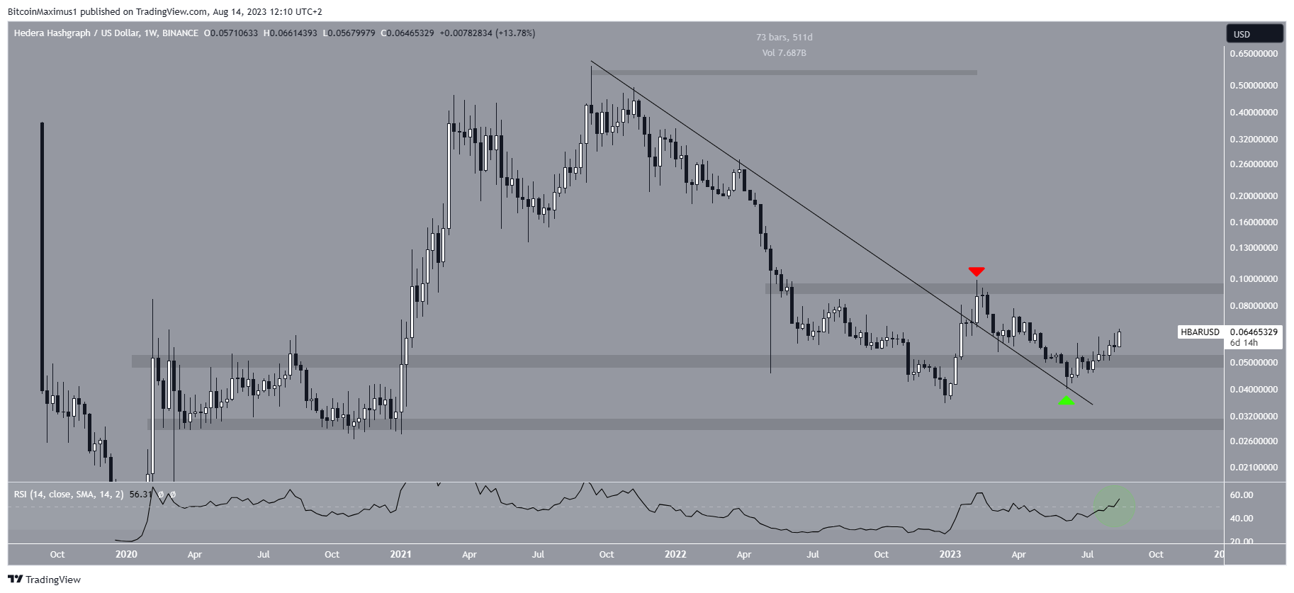 However, HBAR failed to sustain its increase. On the contrary, it was rejected by the $0.090 horizontal resistance area (red icon) the week of the breakdown. It then fell to a low of $0.040 in June, validating the line as support (green icon).