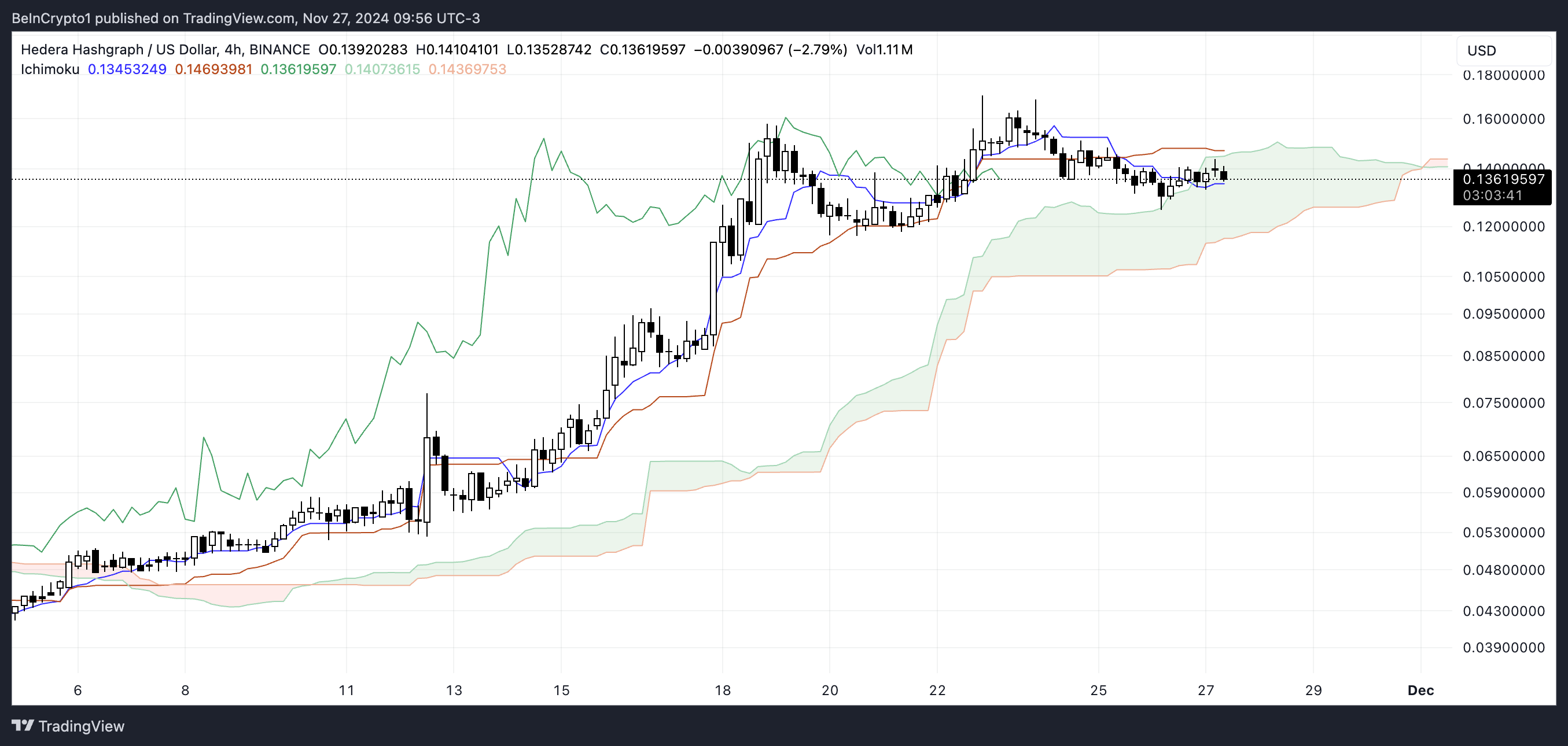 The Ichimoku Cloud chart for Hedera shows the price currently sitting near the Kijun-Sen (orange line) and Tenkan-Sen (blue line), indicating a consolidation phase after its recent rally.
