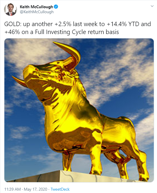 The gold price is trading fractionally lower at last check at about $1,743 and is up more than 14% year-to-date after rising 2.5% last week, as pointed out by Hedgeye Risk Managementās Keith McCullough.