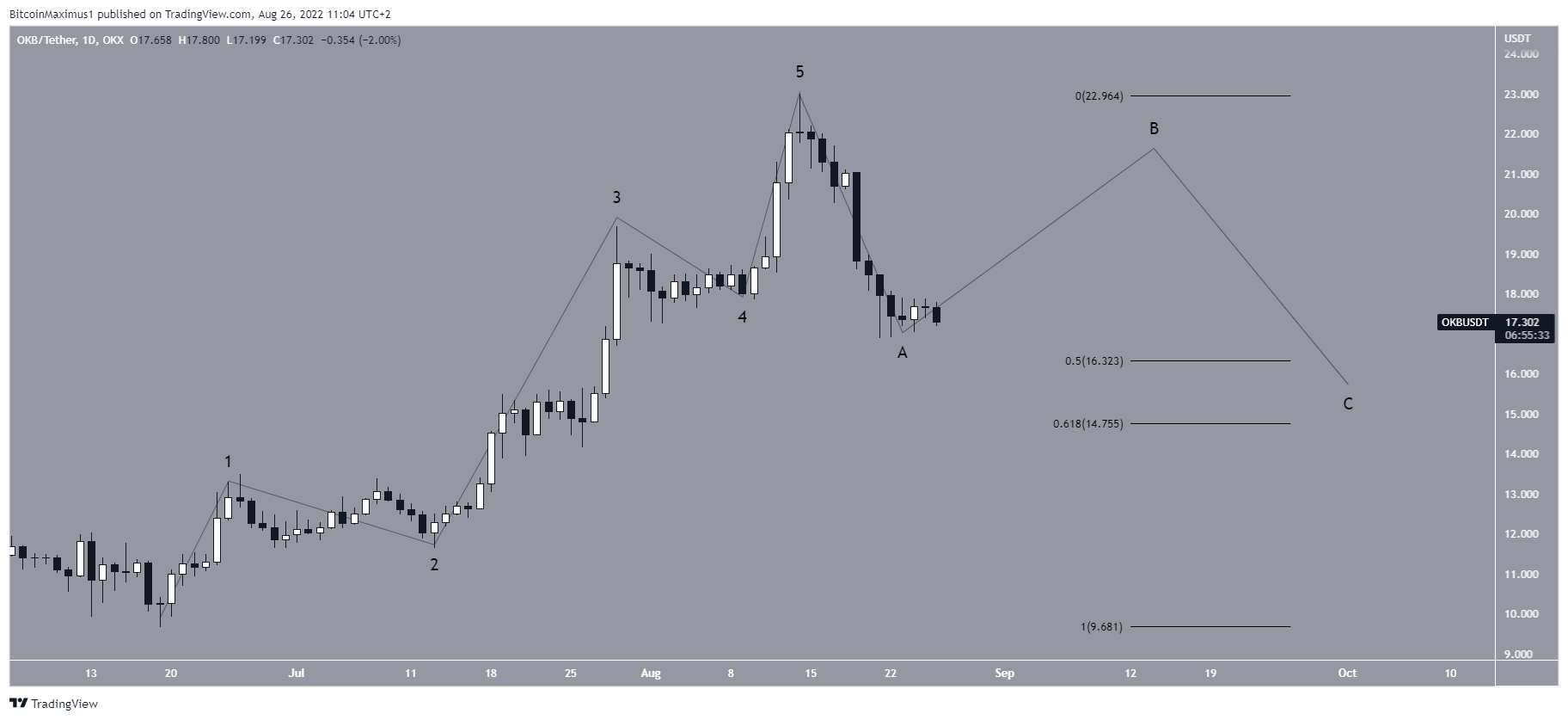 OKB has been moving upward since June 18. The increase resembles a five-wave upward movement and led to a high of $23 on Aug 14. OKB has been moving downward since.