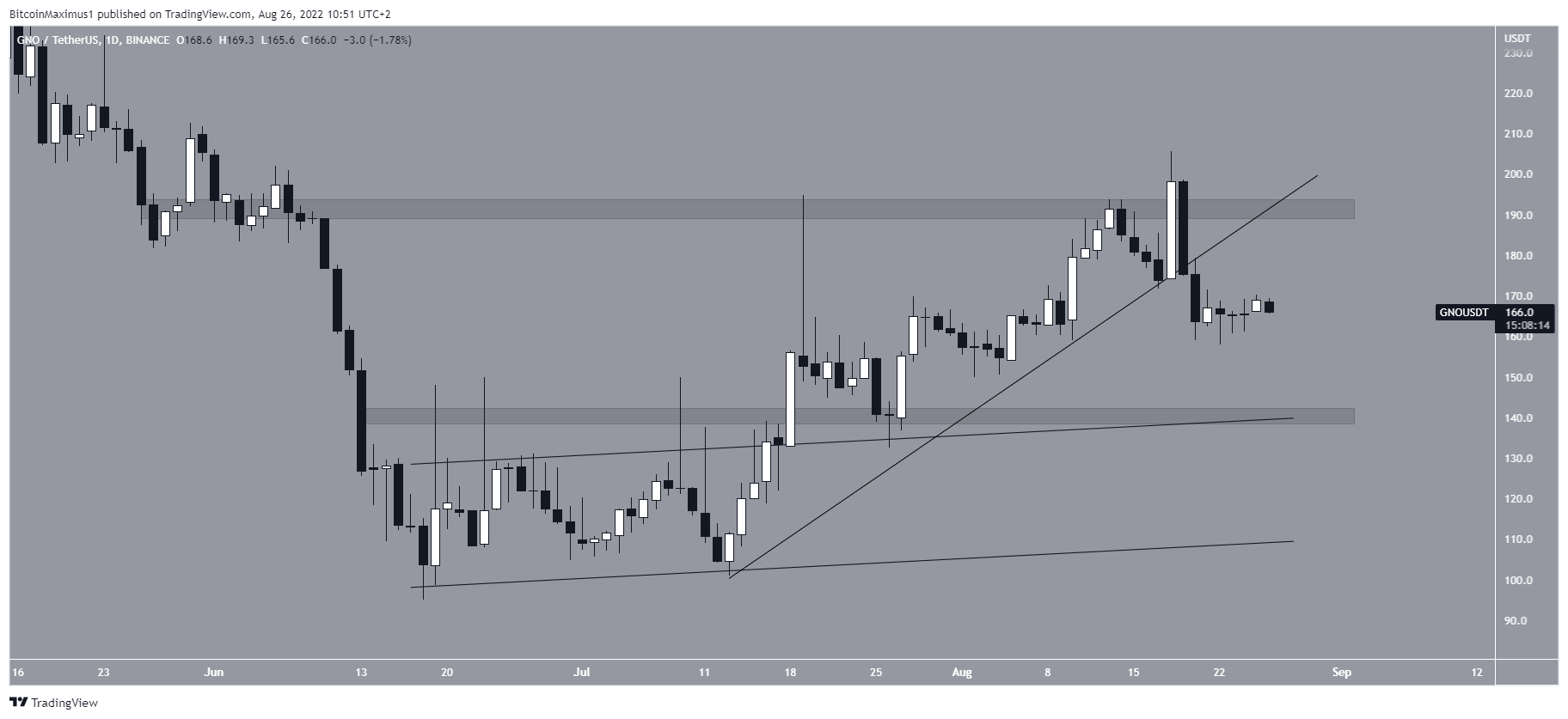 GNO had been increasing alongside an ascending support line since July 14. This upward movement led to a high of $205.50 on Aug 18. However, the price was rejected by the $195 horizontal area and has been decreasing since. On Aug 20, it broke down from the ascending support line.