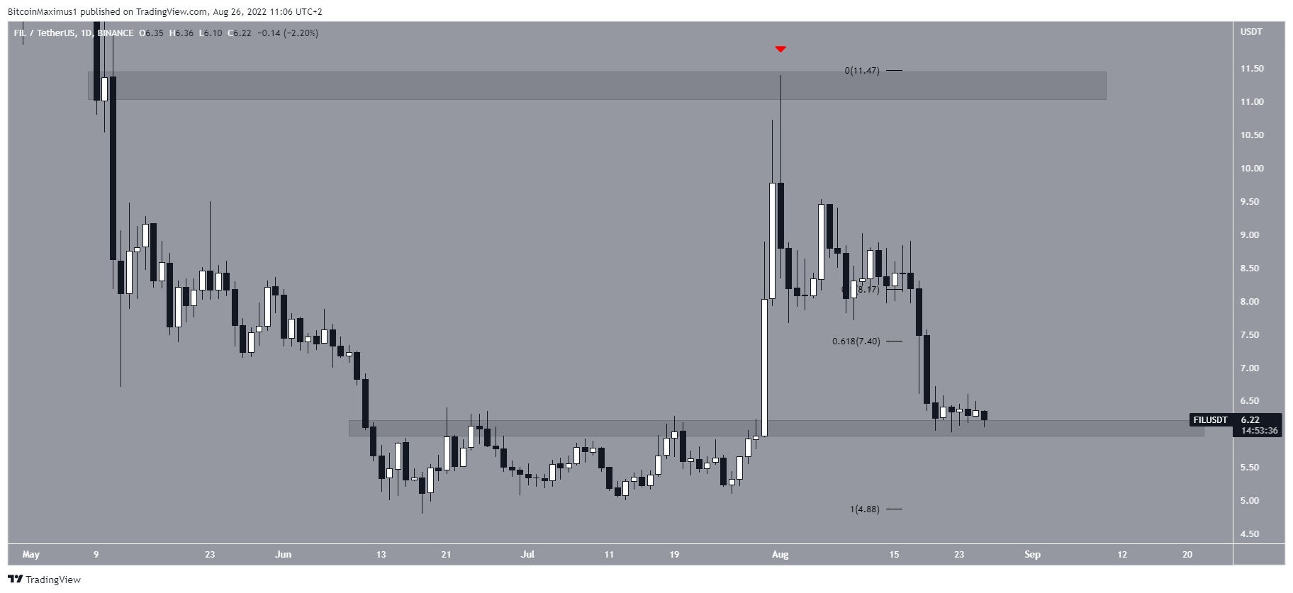 FIL has been falling since Aug 1, when it was rejected by the $11.20 horizontal resistance area (red icon). The rejection and ensuing decrease created a very long upper wick, which is considered a sign of selling pressure.
