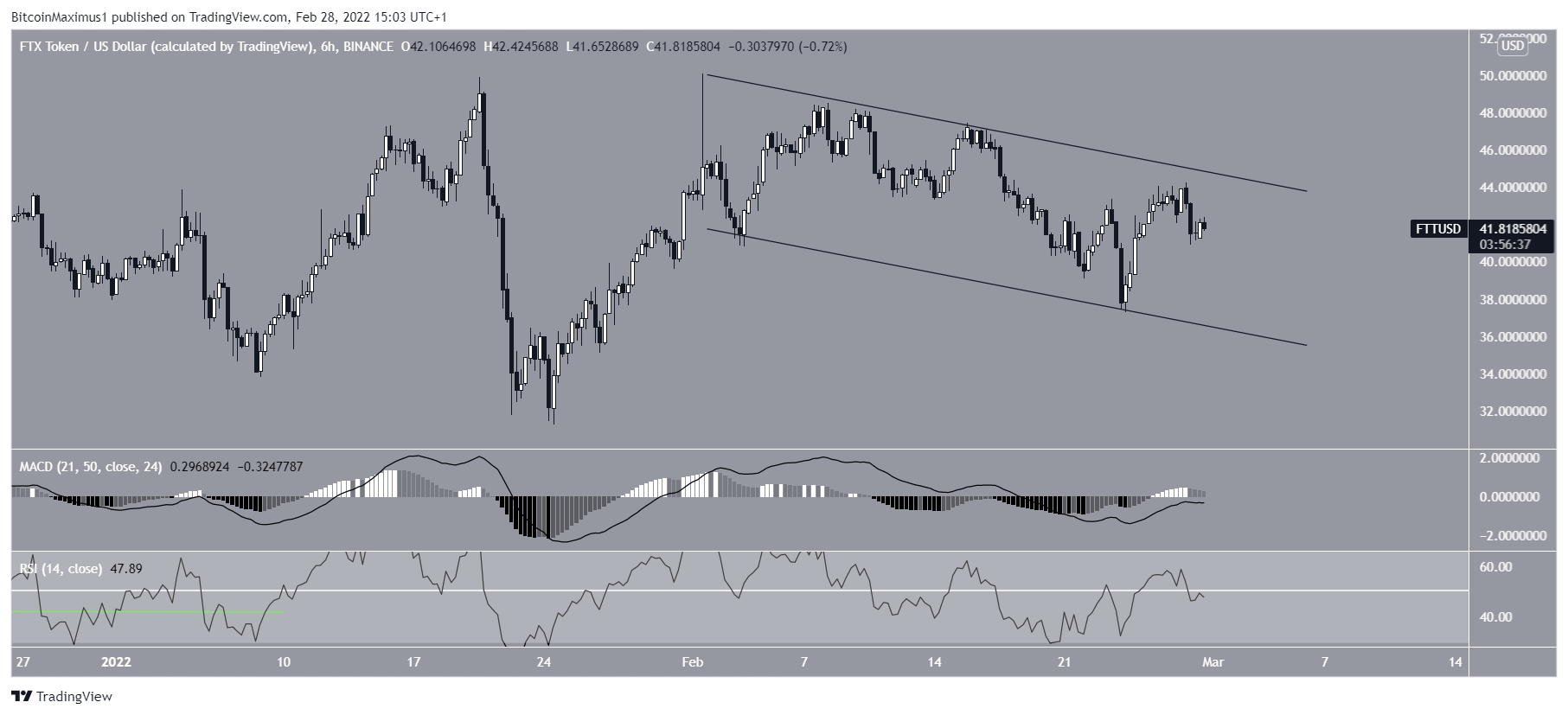 The six-hour time-frame shows that FTT is trading inside a descending parallel channel. This is usually a corrective pattern, meaning that a breakout from it would be the most likely scenario.