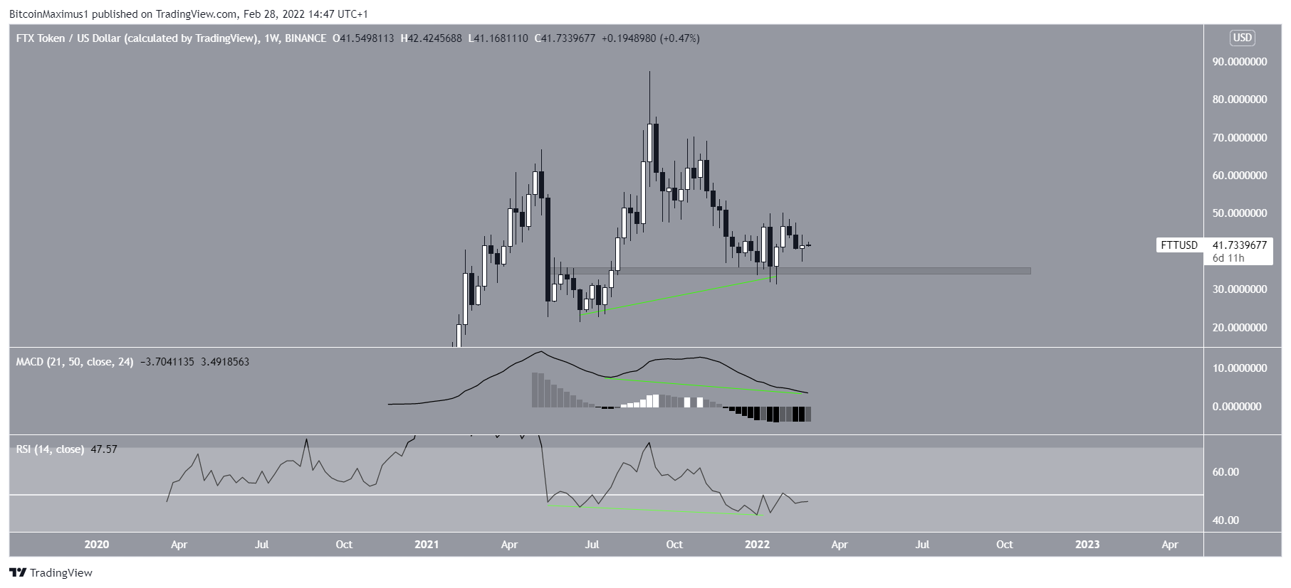 FTT has been falling since reaching an all-time high price of $87.3 on Sept 7. However, the decrease stopped once FTT bounced at the $35 horizontal support area on Jan 24.