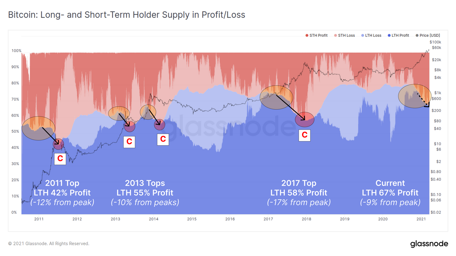 Last week, Glassnode published a very interesting analysis of hodlers in profit on the basis of a comparison of the profit/loss of long- and short-term holder supply in profit/loss. Without going into too much detail, it turns out that all of the cycles to date have been characterized by three phases of “wealth transfer” between market participants: