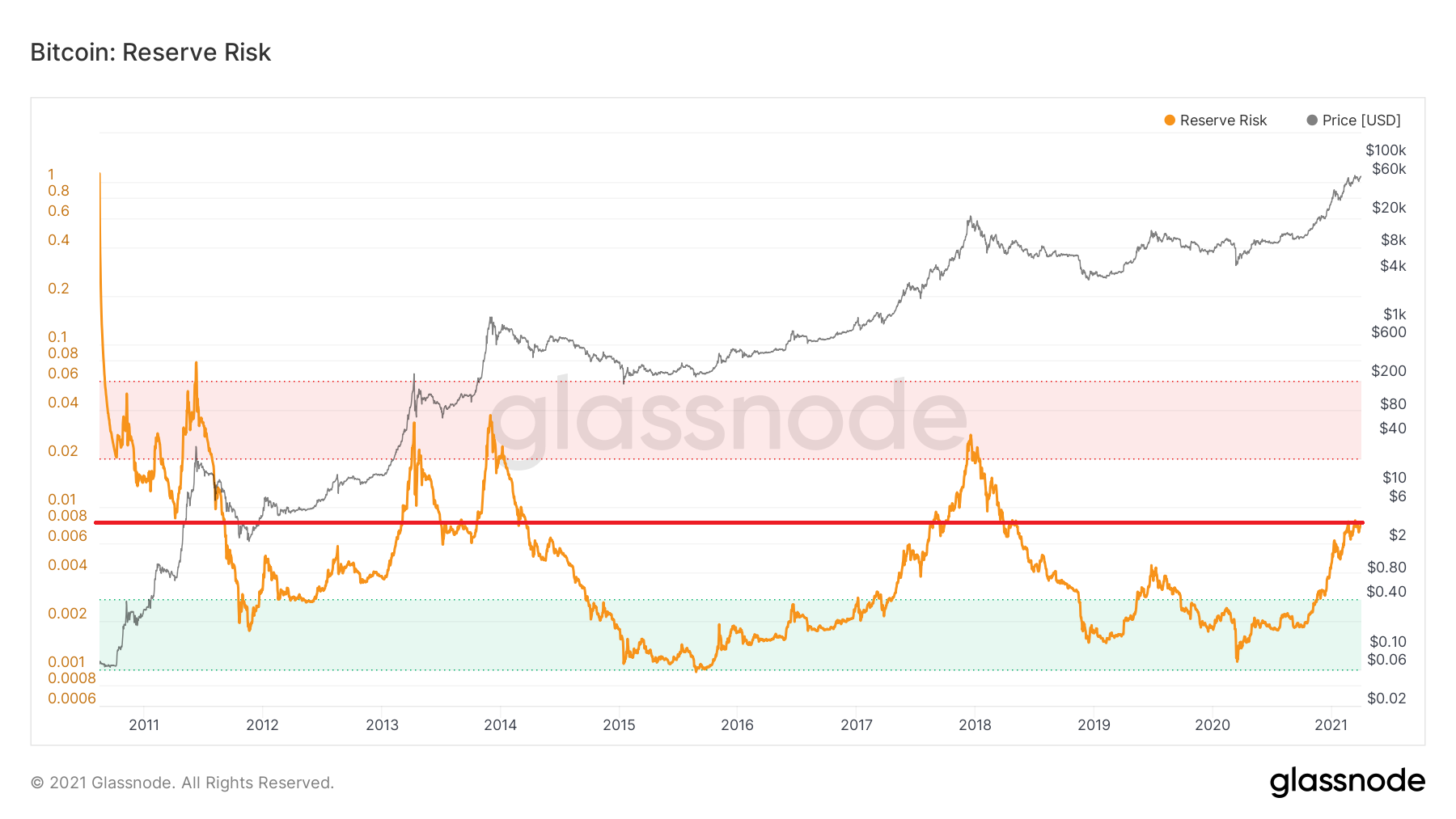 Another indicator that signals a maturing bull market is Reserve Risk. It is used to assess the level of confidence of long-term hodlers in relation to the current BTC valuation. The stronger the hands of the hodlers, the greater their risk tolerance and they are willing to sell bitcoin at a higher Reserve Risk level.