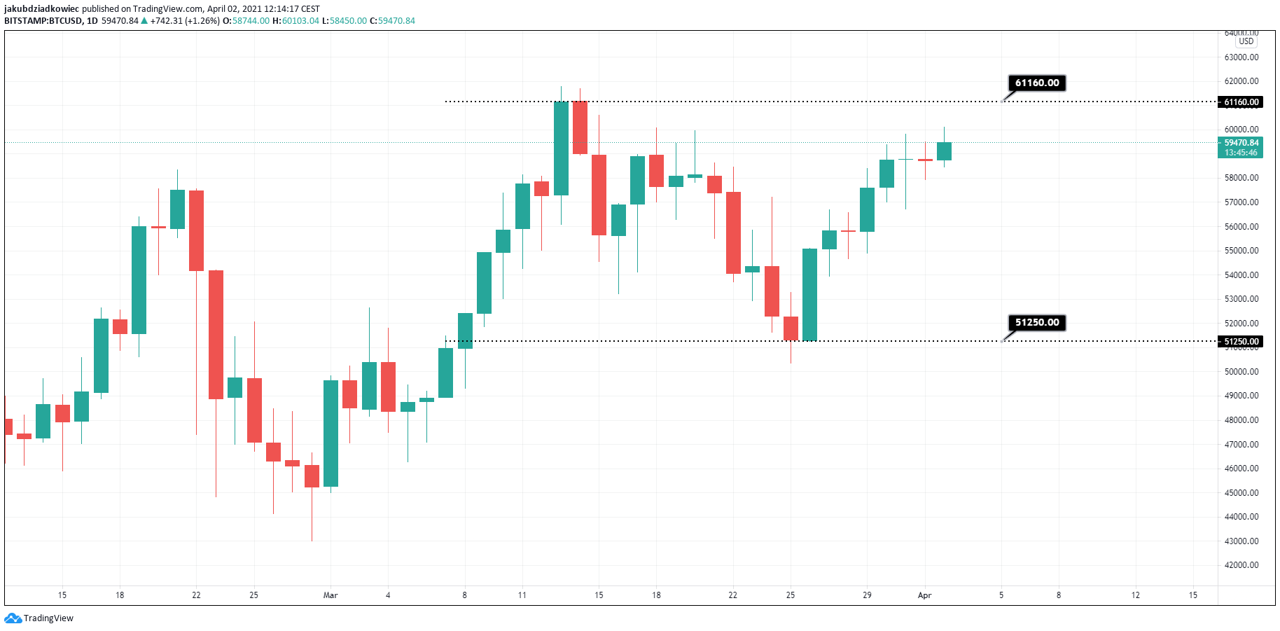 SponsoredOn the daily chart, BTC is still consolidating between $51,250 and $61,160 that has lasted since reaching an all-time high on March 13. Along with approaching the upper end of the range, the correction of almost 20% seems to be coming to an end. Reclaiming the $60,000 psychological price level would send a bullish signal to the market.