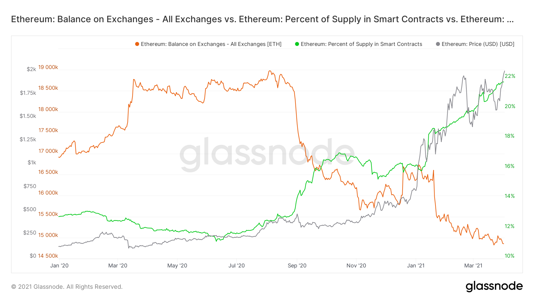 Crypto exchanges already hold only 14.8% of the available ETH, while the value locked in smart contracts reaches 21.8%. The turning point came at the end of summer 2020, at the peak of last year’s DeFi bubble.
