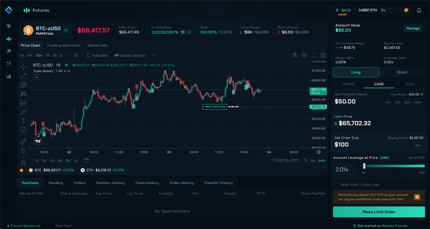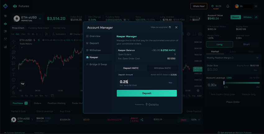 The FAMS also directly integrates Gelato’s automated task execution system which enables and powers the new conditional order features on Horizon Futures. Traders can create conditional orders in the form of limit or stop orders that will execute automatically when the trader’s trigger price is reached.