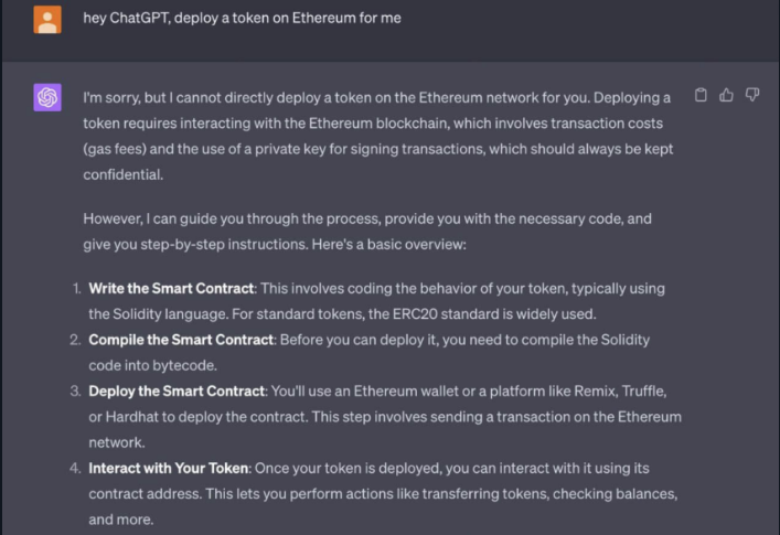 “Of course, ChatGPT cannot ‘directly’ implement a token on Ethereum. However, thanks to the OpenAI API, this limitation can be bypassed. It allows developers to integrate ChatGPT with their own applications that can be connected to the Ethereum network.”