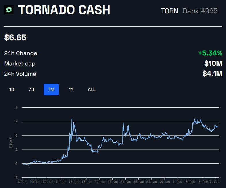 The privacy protocol’s native token has had a solid week with 15.5% gains over the past seven days. Furthermore, TORN is up 5.2% on the day to trade at $6.64 at the time of press.