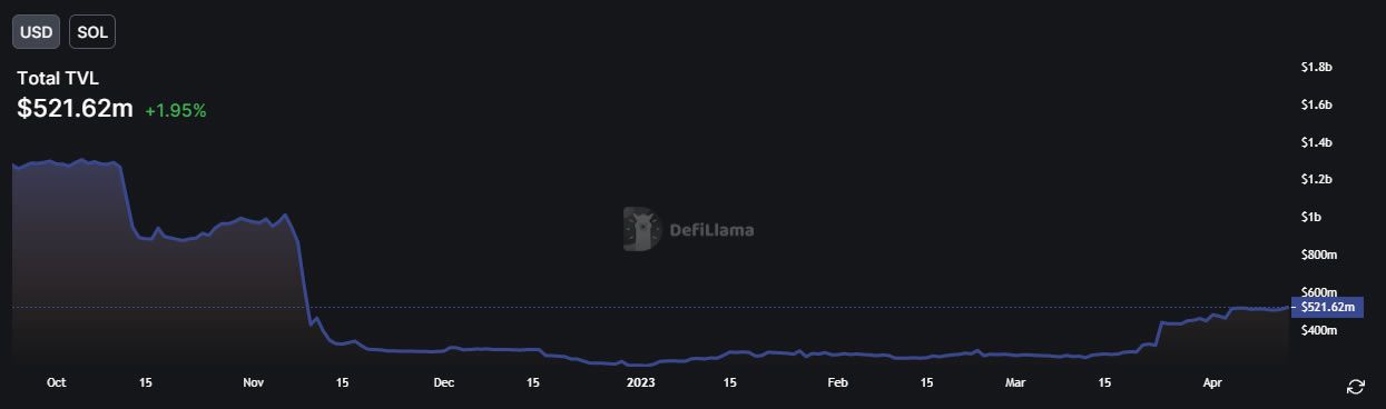 Moreover, Solana DeFi is also in the doldrums. The total value locked in Solana DeFi is currently $519 million, according to DeFiLlama. DeFi TVL is about half of what it was just before the FTX collapse.