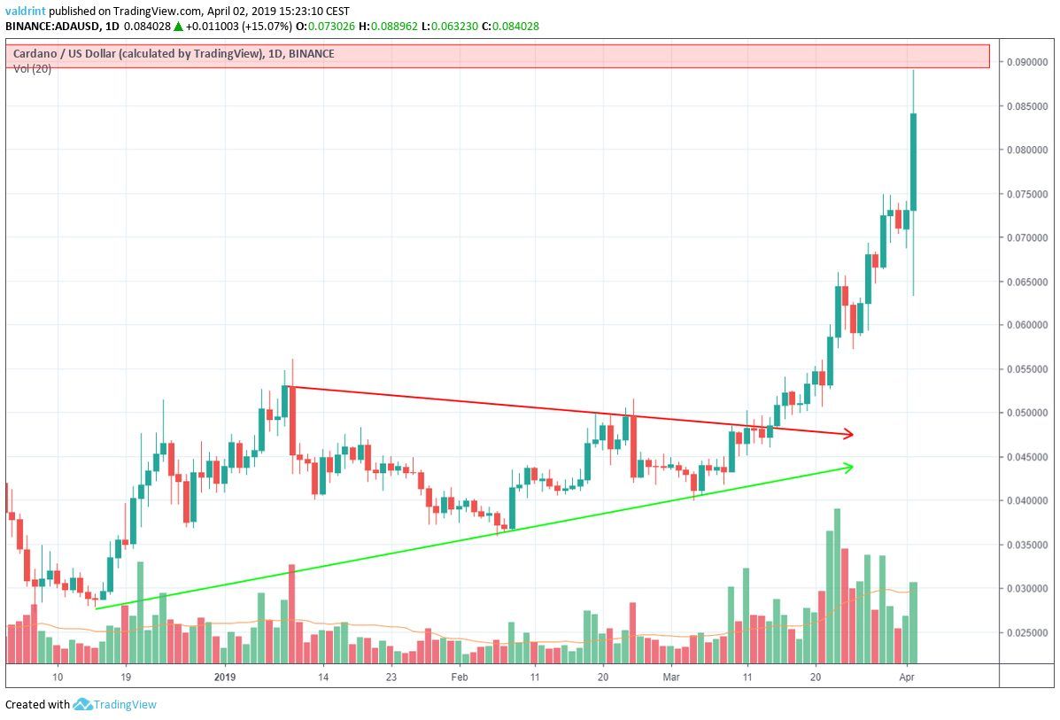 A rapid spike occurred at the beginning of April 2019. At the time of writing, Cardano had already reached a high of $0.088 on Apr 2.