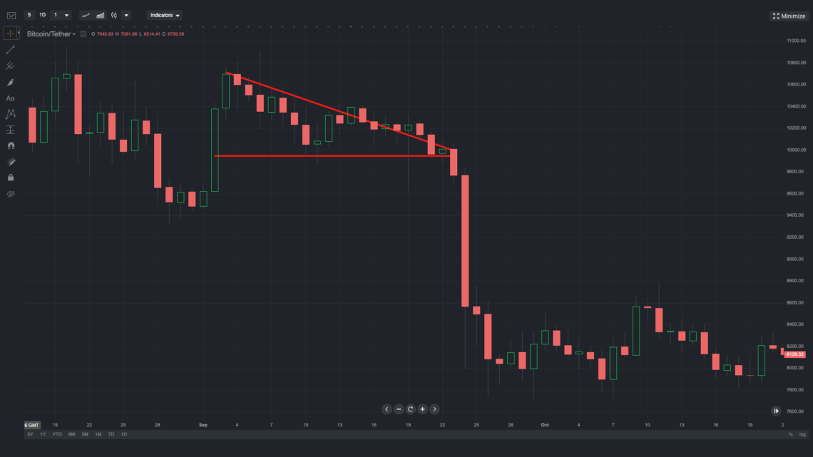 Trend lines are the swiss army knife of cryptocurrency traders and are arguably the most important tool used for predicting price trends. These are lines that are drawn over the peaks and valleys in a chart to gain an understanding of the prevailing price trend. As we’ll see, trend lines can be used to produce a variety of chart patterns that can be used to predict a bullish or bearish break.