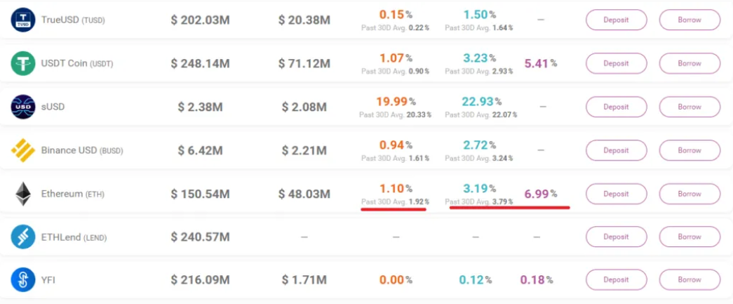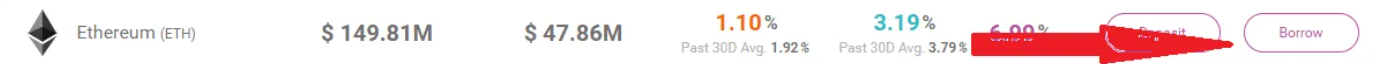 In this example, one can borrow ETH with an interest rate of 3.19% variable APR and 6.99% fixed APR.