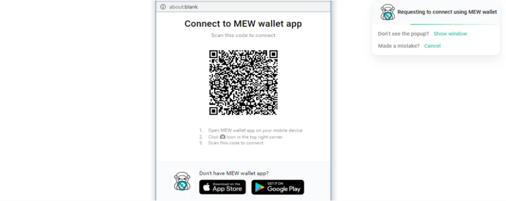 So we come back to the “wallet connect” screen (seen above). You have many choices, and one of the most common wallets is the MEW wallet. If you choose MEW, you’ll run into a problem. The MEW wallet requires you to connect via the mobile app, so you’ll need to go to your app store and download the mobile version of the wallet.