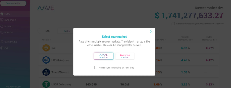 Now, it will ask you to choose your market: Aave or Uniswap. For now, we will choose Aave as it is more straightforward. It is possible to change this later down the line.