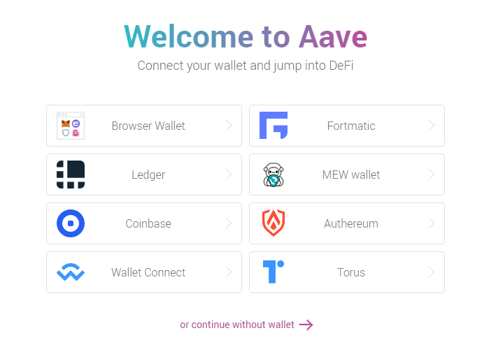 If you already have a cryptocurrency wallet, you can connect it directly to the Aave platform. Aave accepts several different types of wallets, including Ledger, Coinbase, Wallet Connect — which can be used to connect several kinds of wallets — and more. Even without a wallet, it is possible to begin the borrowing process.