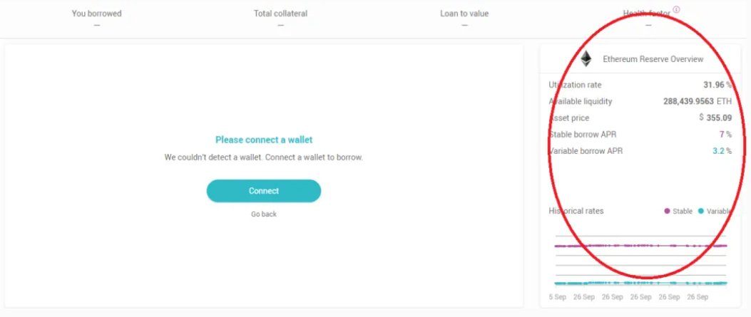 At this point, the site will let you know that you do indeed need a wallet. You can’t do anything without a wallet except look at the different lend and borrow rates. In this case, we will chose ETH, and see the offered rates.