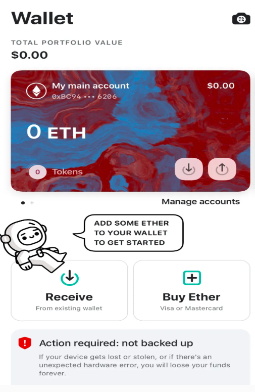 Finally, we have a wallet. Now, we have to put some currency into it! Since we are using ETH in this example, we need to fund the wallet either by purchasing ETH with a card or from a bank account, or by transferring it from another wallet.