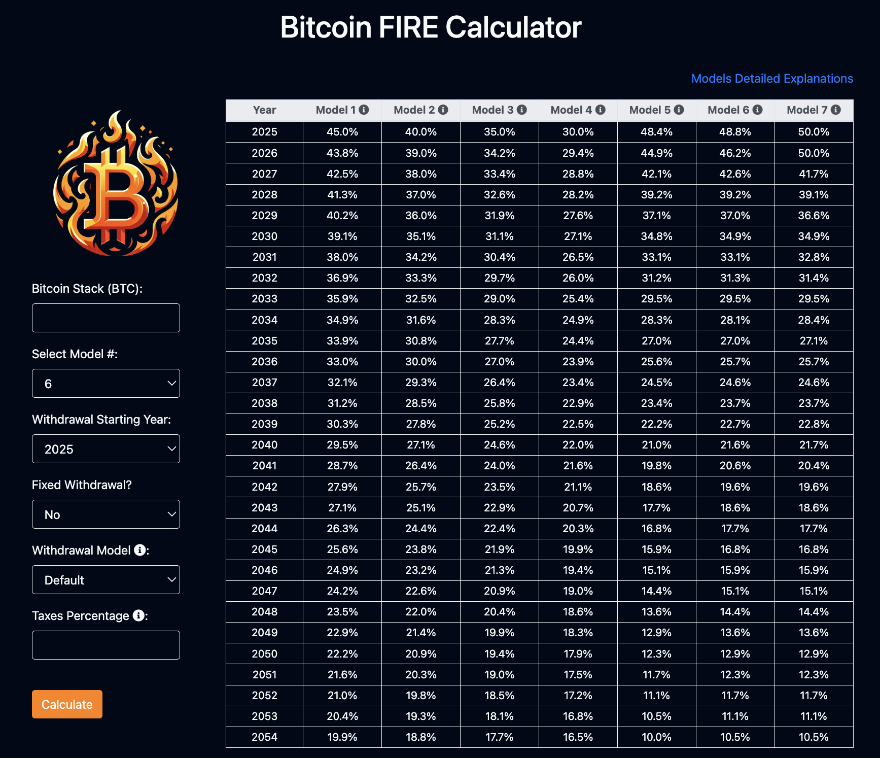 This tool incorporates various Compound Annual Growth Rate (CAGR) models tailored to Bitcoin’s unique market cycles. The calculator allows users to project Bitcoin’s future value and determine sustainable withdrawal rates based on different growth scenarios.