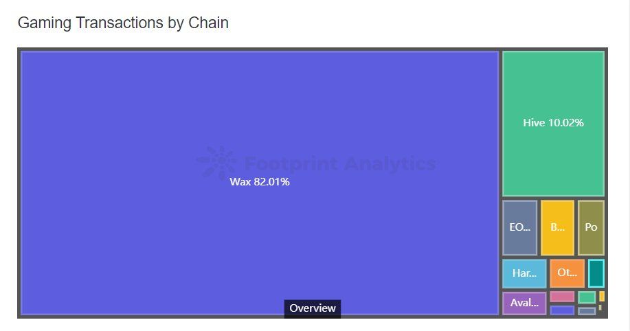 Data from Footprint Networks highlighted that over 82% of the gaming transactions are happening on the Wax blockchain, followed by HIVE with just over 10% transactions.