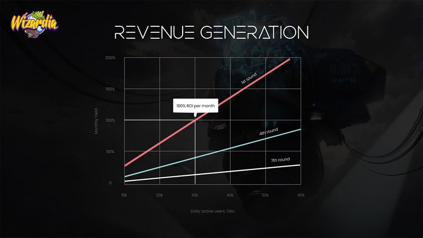 A quick glance at Wizardia’s revenue projection calculator reveals the potential royalties for investors who get in during the first round of the Arena Genesis NFT private sale – a figure no less than 100% ROI (return on investment) per month, assuming a player base of 30,000. Please note that this is just a projection that depends on many variables, such as the number of daily game users, number of daily fights, or the Wizardia token price – and no royalties are 100% guaranteed.