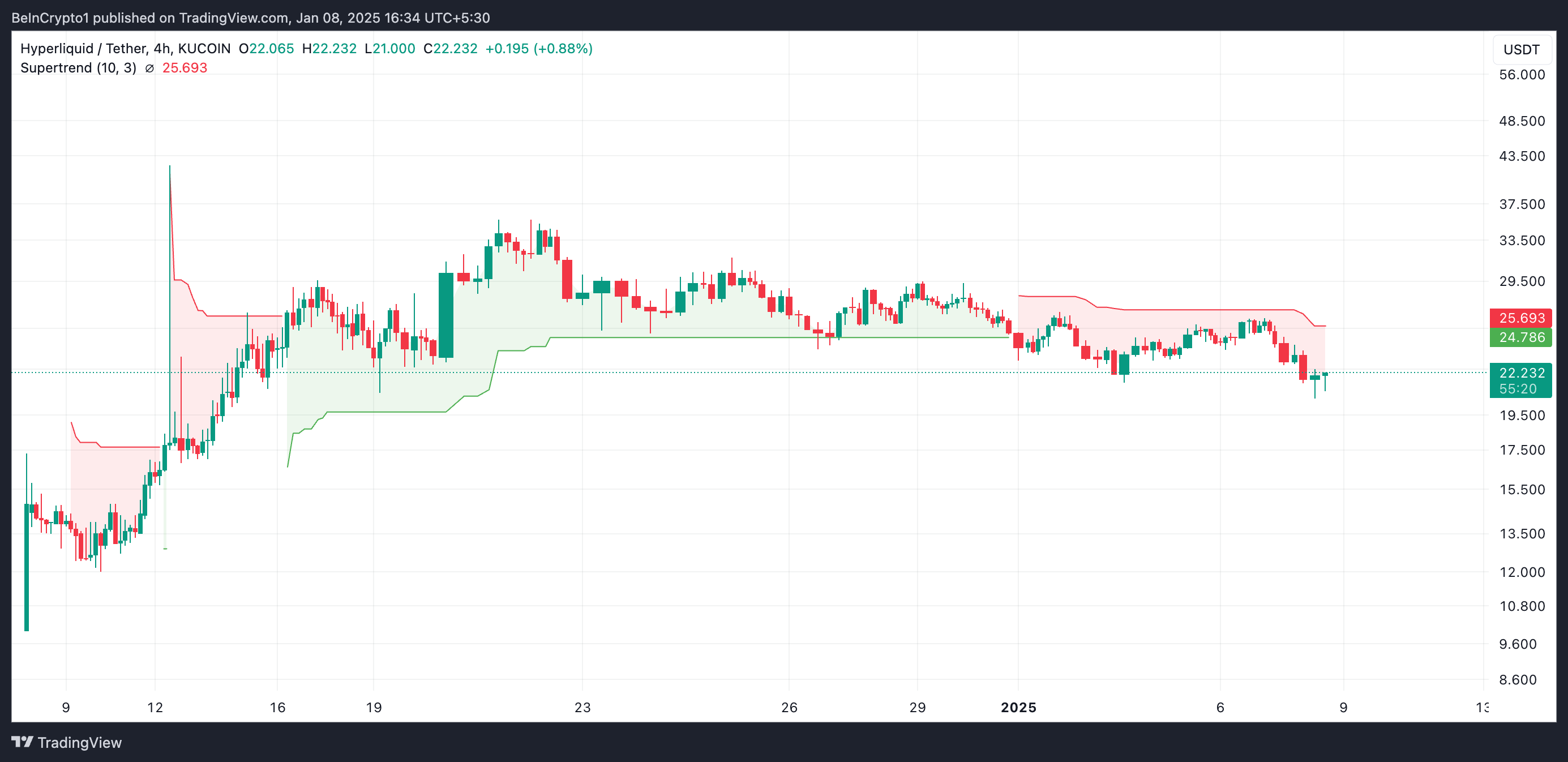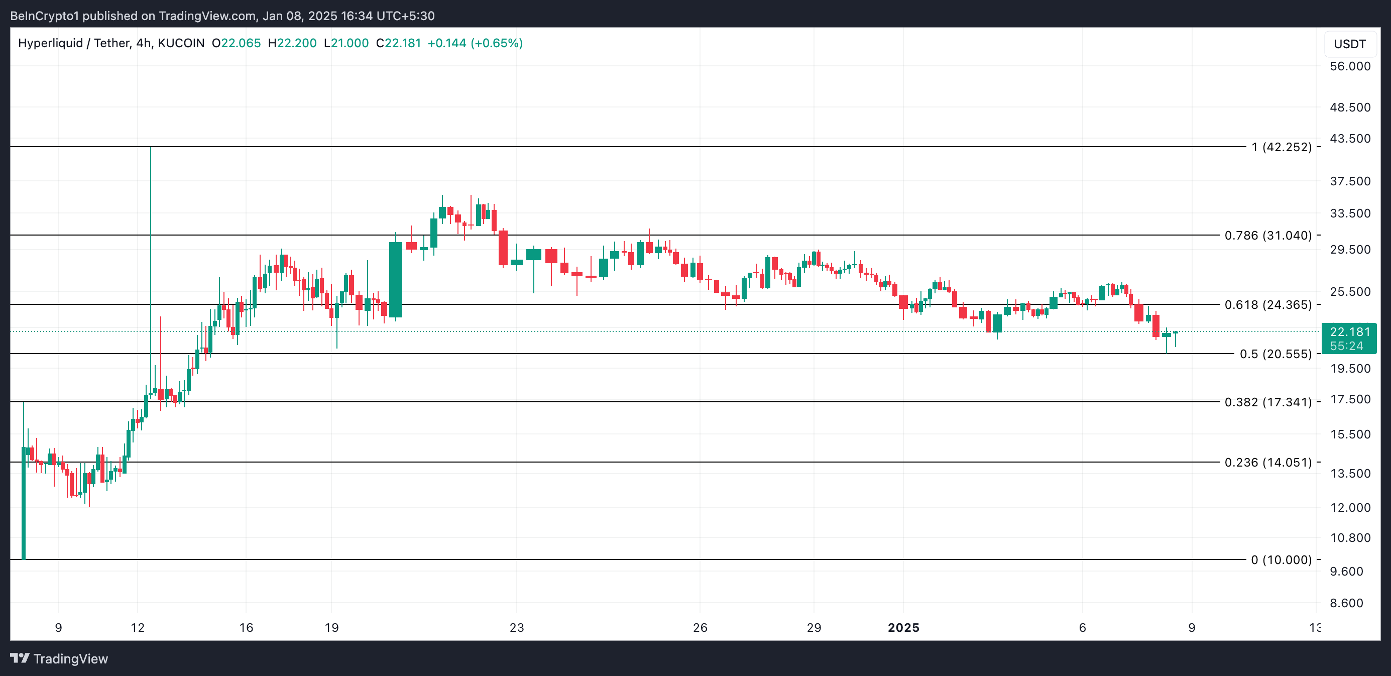 HYPE currently trades at $22.18. If selling pressure persists, the token’s price could plunge below $20 to exchange hands at $17.34.